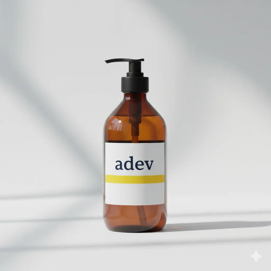 Botol Amber Gelap | Botol kaca/plastik gelap, label gaya apotek. | Premium, Ilmiah, Aromaterapi, Aman. | Sabun cair dengan bahan aktif sensitif cahaya, serum soap. |