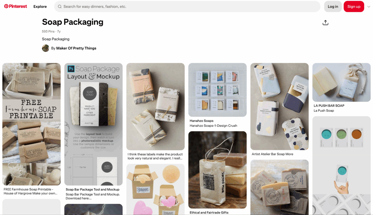 Tempat terbaik untuk membuat moodboard visual. Cukup ketik “soap packaging” dan Anda akan menemukan ribuan ide dari seluruh dunia.